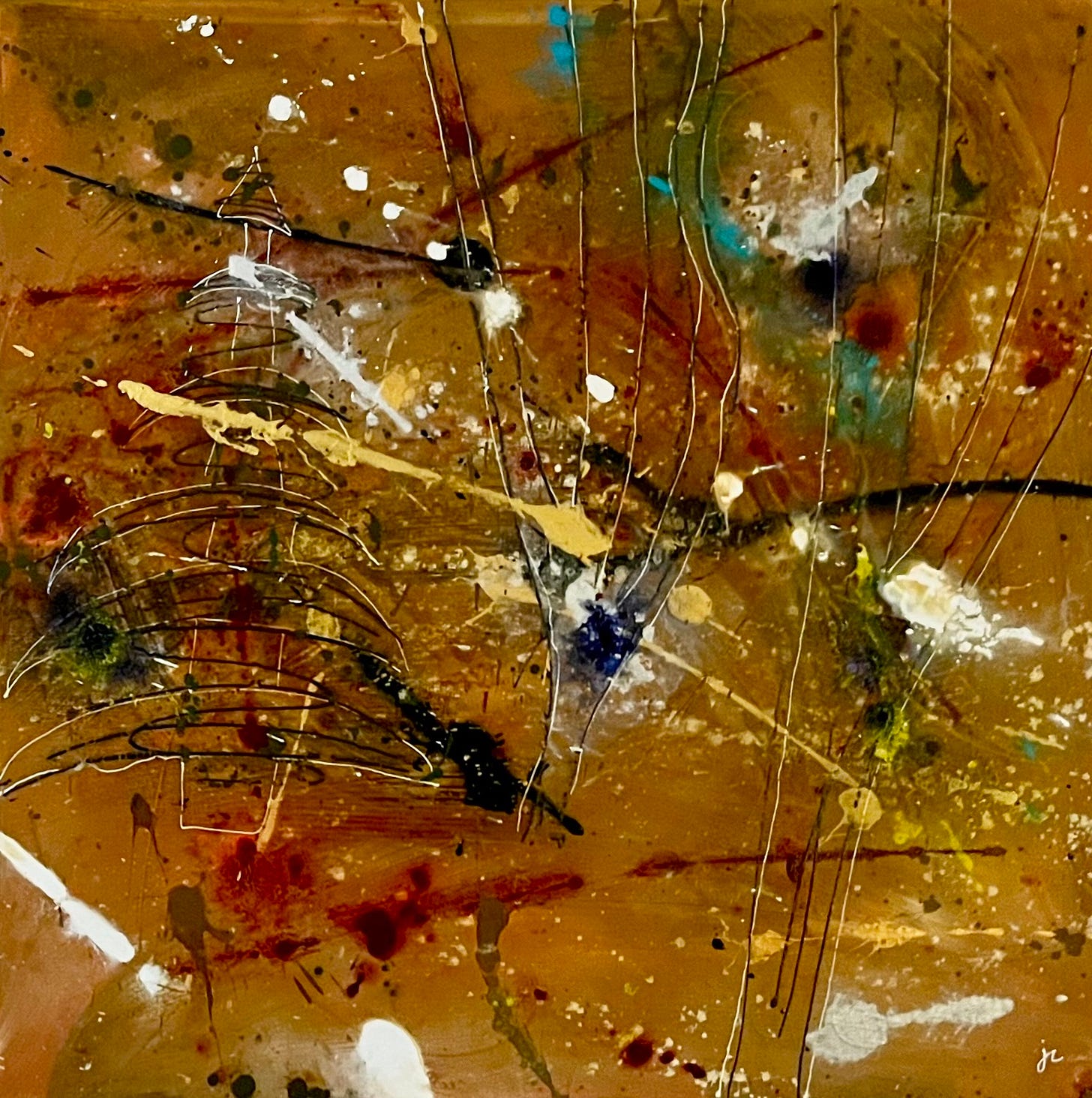 This abstract painting from 2022 hangs above my sofa.